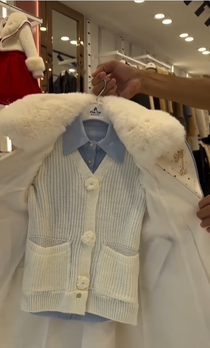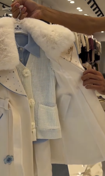 Alaadin Kids Cozy Winter Coat – معطف أطفال شتوي دافئ أبيض وأزرق مع فرو صناعي وتصميم زهري