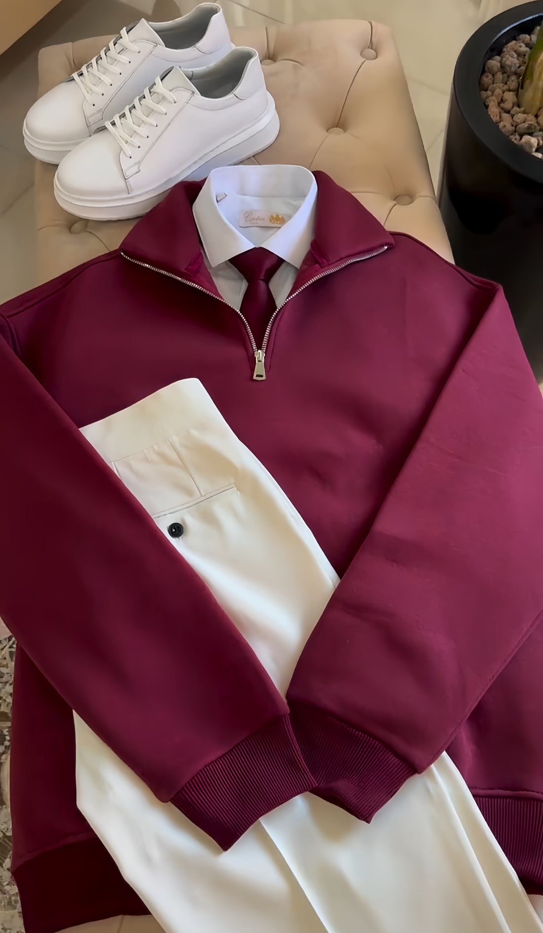Perfect Combo: Shirt, Pant & Sneakers"التركيبة المثالية: قميص، بنطال وأحذية رياضية!" – Red & Off-White Color.