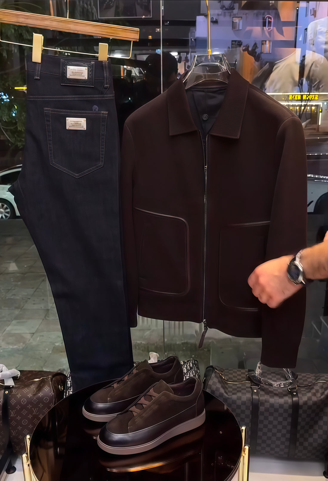 Perfect Combo: Jacket, Pants & Sneakers "التركيبة المثالية: قميص، بنطال وأحذية رياضية!" – reddish-brown color