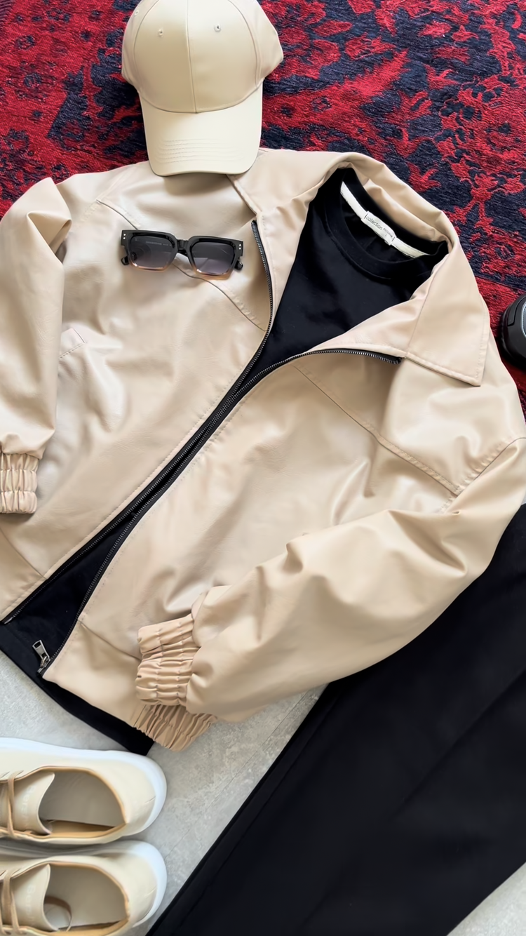 - Beige Sneakers – Comfortable, lightweight and matching the jacket