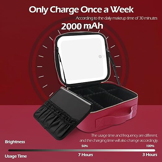Crafted with a delicate synthetic leather finish, this makeup case is waterproof and abrasion-resistant. Designed with an ergonomic handle, secure lock, and aluminum metal hinges that resist corrosion and wear.
