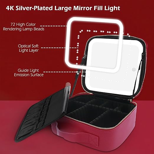 The MOMIRA makeup case features a large-capacity cosmetic storage compartment, a dedicated makeup brush board, a 4K silver-plated cosmetic mirror, and adjustable fill lighting with three modes. Perfect for travel or business trips—take your personal dresser anywhere.
