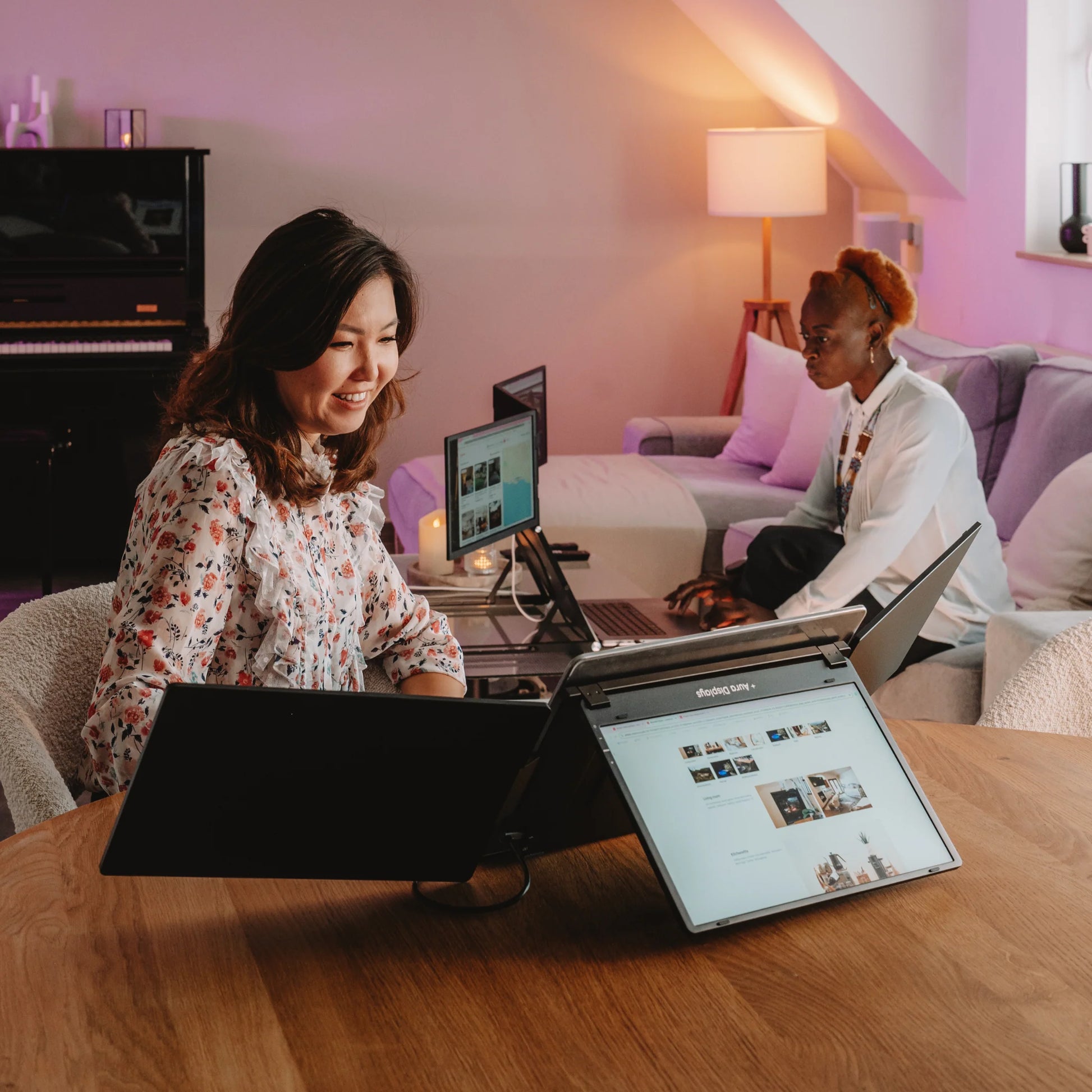 وضع الاجتماعات الذكي: يمكن ترتيب الشاشات على شكل مثلث للعمل مع الآخرين، أو استخدام شاشة واحدة عند ضيق المساحة.
